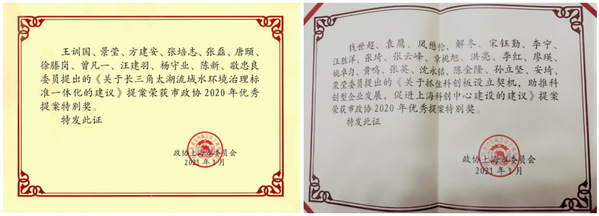 唐颐、陈新委员参与联名的《关于长三角太湖流域水环境治理标准一体化的建议》,孙立坚委员参与联名的《关于抓住科创板设立契机,助推科创型企业发展,促进上海科创中心建设的建议》,荣获政协第十三届上海市委员会2020年优秀提案特别奖。