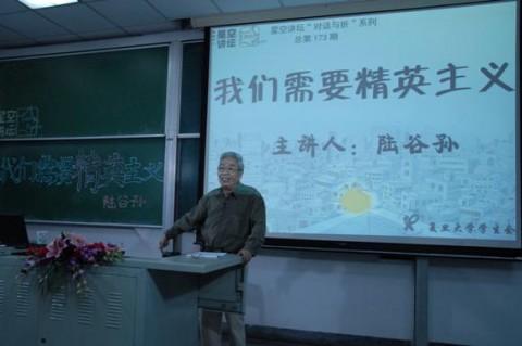 2009年10月27日18:30,年逾古稀的英文系教授陆谷孙精神矍铄地走上3208的讲台,面对台下那求知若渴的眼神,为复旦学子带来了一场思想盛宴《我们需要精英主义》。作为星空讲坛的第173期,陆老为星空增添了一股浩然之气、长者之风。理想与现实相交,睿智与幽默并举,同学们在轻松、欢快的气氛中加深了对精英主义的理解和对读书的重要性的认识。