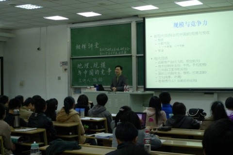 此次讲堂受到同学们的追捧,教室里座无虚席。陆铭老师用诙谐幽默的言语、缜密细致的思维,深入浅出地分析了规模、地理在经济中的作用,进而谈到其与中国竞争力的关系。从历史到文学,从经济到教育,陆铭教授博学的才识与启发式的互动赢得了在场同学们的阵阵掌声。陆教授的讲座主要围绕规模、地理与中国的软实力三个部分进行,以经济学家的视角与同学们分享了他对文化的独特认识,他认为中国特殊的地理优势有助于中国规模经济的形成,是提高以文化为载体的中国软实力的良好契机,可以作为中国不断探索和推进自我经济发展模式的有效途径。讲座结尾,陆教授还谈到他对于教育体制的认识,强调教育对中国未来发展的重要性,提出在进行通识教育的同时也要发展起能体现中国特色与优势的“差异教育”,为我国日后经济发展和软实力的提高打好“人力资源”的基础。在随后的提问环节中,同学们积极踊跃地提出自己的疑问与困惑,并及时得到了陆铭老师的详细解答,场上场下的互动一度将场面推向高潮。历时两个多小时的整场讲座中,陆铭老师的学术底蕴与胸怀天下的社会责任感给现场每位听众留下了深刻印象,教会同学们思考如何做一名敢于承担的当代大学生。