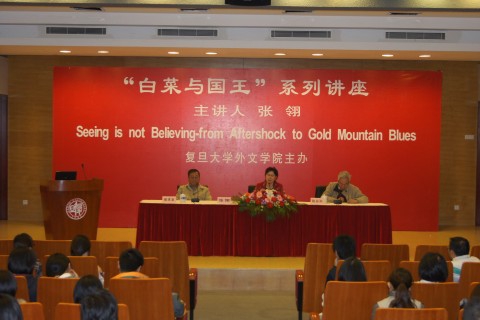 2010年10月26日14:00点,由复旦大学外文学院主办的“白菜与国王”系列讲座,邀请电影《唐山大地震》原著《余震》作者张翎女士以“眼见为虚——从《余震》到《金山蓝调》”为题进行了英文专题演讲。张翎女士是外文学院83届院友,旅加华裔作家,此次回校与母校学子畅谈文学创作,复旦大学杰出教授陆谷孙,外文学院院长褚孝泉出席了此次活动。