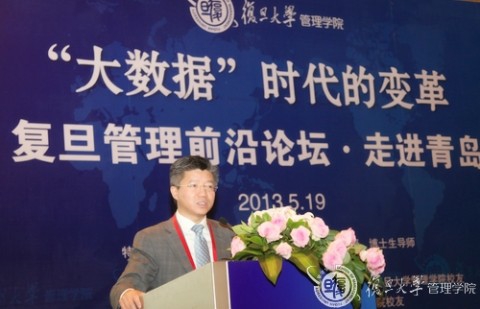 陆雄文院长接下来在论坛上致辞。他首先赞赏了青岛悠久的历史传统和重要的经济地位,强调复旦乐意与青岛市合作,培养一批优秀的管理学人才。其次,陆院长介绍了管理学院在MBA和EMBA办学上取得的成绩,指出复旦大学管理学院是国内最具有国际水准,同时基于中国本土的管理学院。陆院长还介绍了我院近年来在公益活动上的努力,如“蓝墨水活动”等一系列公益服务活动的举行,践行了学院的社会责任。关于大数据这个话题,陆院长指出,在未来数据将会像土地、石油和资本一样,成为经济运行中的根本性资源。因此在大数据时代,掌握数据就掌握了财富。如何挖掘、分析和运用这些数据,正是‘大数据’的核心。陆院长特别强调,作为世界上人口最多的国家,中国产生数据的实力可想而知,即便能掌握其中一部分大数据,对于企业发展也具有不可估量的价值。”