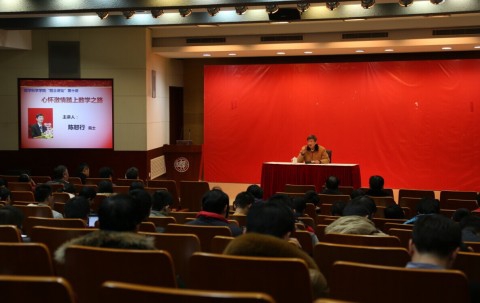 2014年12月29日,数学科学学院在光华楼东辅楼102报告厅举行第十期院士讲坛学术活动,邀请中国科学院院士、著名数学家陈恕行教授为全院师生做主题为“心怀激情踏上数学之路”的讲座,院长郭坤宇教授主持讲座。