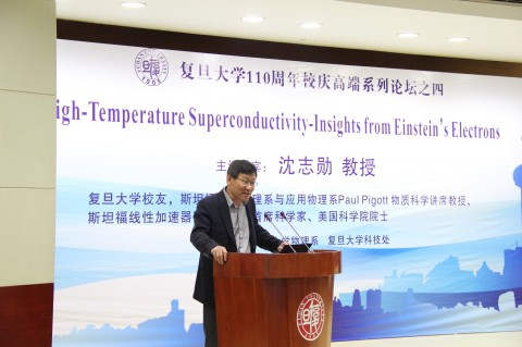 本次报告是复旦大学110周年校庆高端论坛的报告之一,由物理系和科技处联合举办,沈志勋教授的同学、物理系教授金晓峰老师担任报告主持人。