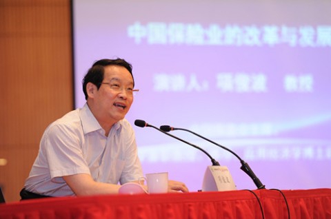 随后,项主席教授详细介绍了我国保险业改革发展的基本情况。他提出,中国保险业的发展历史有200年之久,在改革开放后发展迅速,现已成为国际上举足轻重的新型保险业大国:2014年我国的保费收入已超过英国跃居世界第三;保险业市场规模仅次于美国、日本;保险经营机构占全球总量的8%。同时中国还加入了国际保险IAIS,成为其四个主要成员之一。作为我国金融业改革的先驱,早在2004年底中国保险业就实现对外全面开放,率先实现国有金融企业改制上市,建立保险保障基金制度,全面推进行业改革开放。同时保险业在促进经济增长、服务新农村建设、参与社会管理及完善社会保障体系等方面作用显现,勇担责任服务经济社会大局。随着市场化改革、偿付能力体系、监管制度体系、保险行业基础建设等方面不断实现重要突破,推动现代化建设的步伐。保险业的继续发展将对完善现代金融体系、完善社会保障体系、完善现代农业服务体系、完善国家灾害救助体系及完善社会管理体系等五个方面产生不可忽视的作用。但另外,他也提指出我国保险业目前仍然处在发展的初级阶段,还存在不少矛盾和问题,主要表现为“四个不适应”:保险业发展与经济社会要求不相适应;保险服务与人民生活水平不相适应;保险市场秩序与科学发展的要求不相适应;风险防范能力与快速发展的形势不相适应。因此必须始终坚持把风险防范工作放在突出位置,标本兼治守住防范风险底线。