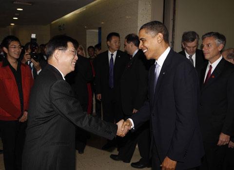 1点左右,杨玉良校长走进会场,向全场500多位听众宣布:“让我们欢迎美国总统巴拉克•奥巴马。”在美国驻华大使洪博培的陪同下,奥巴马总统在全场的掌声中走进会场。走上讲台前,总统特别和坐在通道边的几位复旦学生握手。