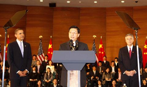 奥巴马总统首先发表了简短的演讲,一句带有美国口音的上海话“侬好”引起了全场的笑声和掌声,这一下子拉近了青年人和美国总统的距离。奥巴马在演讲中表示美中关系在过去30年中取得了长足进展,除了贸易往来大幅增加外,两国的全面合作涉及经济复苏、新能源开发、制止核武扩散、应对气候变化、亚洲及全球和平与稳定等诸多全球性问题。而成功合作的前提是加深彼此了解,开展开诚布公的对话交流。奥巴马说,两国最重要的共同点,是对未来的信念。中国年轻人的才能、献身精神和梦想让我看到了这个古老民族对未来美好乐观的展望。两国的合作应当超越政府层面,真正以人民的合作为基础,而年轻人正是建立这些友好合作桥梁的中坚力量。他表示,美国到中国的留学生人数要增加到10万人,这是美国致力于加强两国人民友好交流的信心和意愿。对美国而言,最好的使者就是富有才能、充满活力、对未来充满信心的年轻人。最后奥巴马希望两国年轻人能共同为美中合作及世界的和平发展而努力。