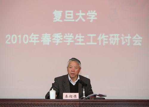 秦绍德在会上传达了市委九届十一次全会精神,要求学工队伍全力投入迎接上海世博会。他指出,要服务世博,充分展示复旦学生精神风貌,做好世博志愿者的组织动员和教育培训等工作;要保障世博,以复旦的稳定维护全市的大局;要研究世博,及早启动“后世博”研究,为政府决策咨询服务。他强调,今年的学生思政工作要抓住世博会举办的契机,让学生在服务世博的同时,经受考验、接受锻炼、大开眼界,接受最生动的爱国主义教育,强化志愿精神和社会责任感,培养世界的眼光,提高节能环保意识,并自觉锤炼个人的精神文明和行为规范。他希望,学生工作者学会思考和把握时机,真正做好思政教育工作。