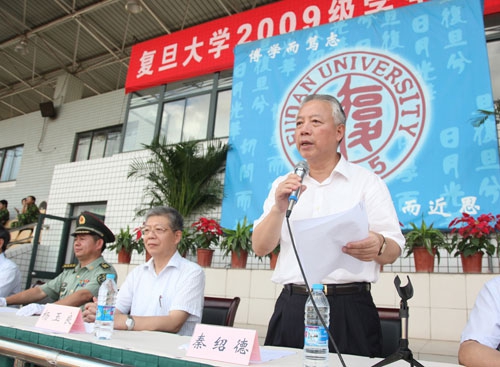 最后,校党委书记秦绍德发表讲话。他首先对2009级全体参训同学圆满完成军训任务表示祝贺,赞扬同学们在酷暑中勇于拼搏、挑战自我的精神,磨练出了坚强的意志和严格的军容风纪。他希望大家能主动适应时代的要求,把务实精神和远大理想结合起来,把个人的发展和祖国的振兴、人民的事业结合起来,把军训中学到的好传统、好作风更好地体现在今后的学习和生活中,不断地加强自身修养,勇敢地担负起国家和民族赋予的重任。秦绍德书记还对来自73031部队的教官和全体辅导员表达衷心的感谢和亲切的慰问,感谢他们以身作则、任劳任怨,保证了军训的顺利开展。