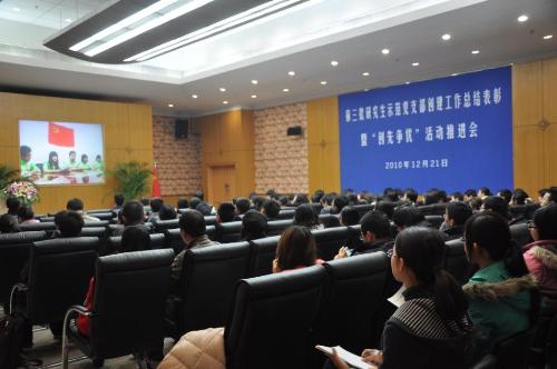 12月21日下午,我校第三批研究生示范党支部创建工作总结表彰暨创先争优活动推进会在逸夫科技楼隆重举行。校党委副书记陈立民出席并做重要讲话,相关部处负责同志和各院系学生工作首要负责人出席会议。来自各院系的90多名研究生党支部书记听取了经验交流报告,学习工作经验。