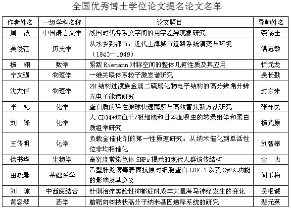 我校今年共有3篇博士学位论文入选2010年全国优秀博士学位论文,另有12篇博士学位论文入选全国优秀博士学位论文提名论文(详见附表)。在从1999年开始的12次全国优秀博士学位论文评选中,我校已获得全国优秀博士学位论文51篇,在全国各高校中位列第三,并累计有53篇博士学位论文获得全国优秀博士学位论文提名论文。