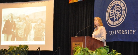 George Mason大学主管中国事务的老师、上世纪七十年代末在复旦就读及任教的Madelyn Ross女士在当天的开幕式上致辞。她回忆了当时在复旦的生活和工作,特别感谢了苏步青和谢希德两位老校长对外国留学生的关心。