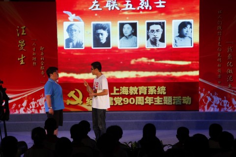 在上海教育系统庆祝建党90周年主题活动暨“百问先烈---穿越时空的对话”校园先烈寻访系列活动展演的现场,有着光荣的革命传统和深厚文化底蕴的复旦剧社通过一台校园剧的形式展示了上海教育系统在学习革命英烈和庆祝建党90周年系列活动中所形成的“七个一”成果:一组图文并茂的上海教育系统校园烈士事迹展览;一本讲述上海高校烈士故事的《上海高校英烈谱》;一本收录校园先烈名言、学生百问和学习感悟的《红色手记》;一套通过课堂讲课生动展现上海各校爱国主义教育基地的《红色一课》光盘;一册收集了上海各校爱国主义育人资源的《红色地图》;一次寻访上海校园先烈的“红色之行”;一台体现上海学习寻访校园先烈庆祝建党90周年的展演剧目。