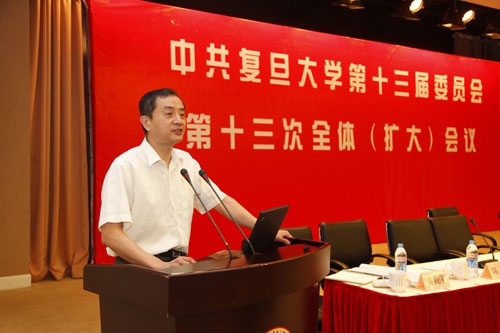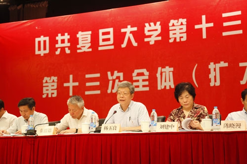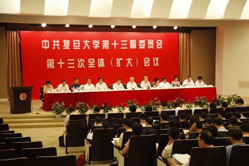 新闻中心讯 7月14至15日,中共复旦大学第十三届委员会第十三次全体(扩大)会议在光华楼举行。会议的主题是:学习贯彻胡锦涛总书记在庆祝中国共产党成立90周年大会上的重要讲话精神,贯彻落实《国家中长期教育改革和发展规划纲要》提出的各项任务,以提高人才培养质量和科学研究水平为主线,以建立有中国特色的社会主义现代大学制度为目标,深化改革,加快发展,使我校的综合实力在“十二五”期间迈上新台阶。校党委常委会主持会议。党委书记秦绍德,党委常委、校长杨玉良分别在会上作了重要讲话。