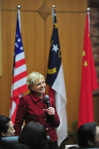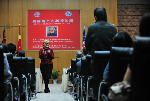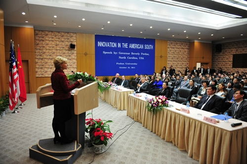 裴铎丽首先介绍了北卡罗来纳州的大学教学,并希望教育体系能够通过自身的变革来应对经济全球化的挑战,同时也深深以北卡罗来纳大学与复旦大学的伙伴关系为荣。接下来,她简单介绍了北卡罗来纳州的基本情况和发展愿景,指出在当今经济全球化发展形势下要重视科技创新和大学教育,她强调“投资教育是我们能够做到的刺激就业机会增长的一件大事。对于美国和中国的经济健康发展以及经济未来而言,具有全球竞争力的创新型现代工业有着举足轻重的地位。” 同时,她希望通过扩展新兴产业和传统产业转型来发展州经济。