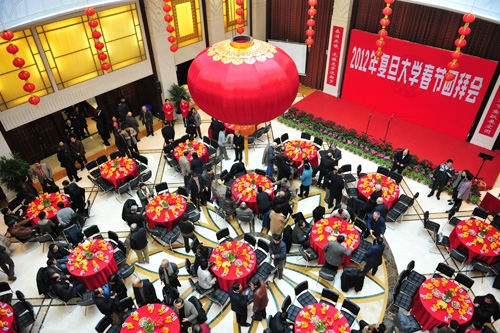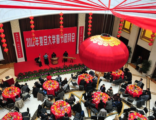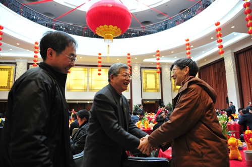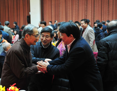 新闻中心讯 1月16日上午,2012年春节团拜会在光华楼十三楼多功能厅举行。校党政领导、专家学者代表、各单位、部处和各附属医院主要负责同志、各民主党派负责人,以及部分老同志等270余人欢聚一堂,共迎壬辰年新春。会场布置朴素雅致,花芳茗香。场内气氛喜庆祥和,笑语不断。