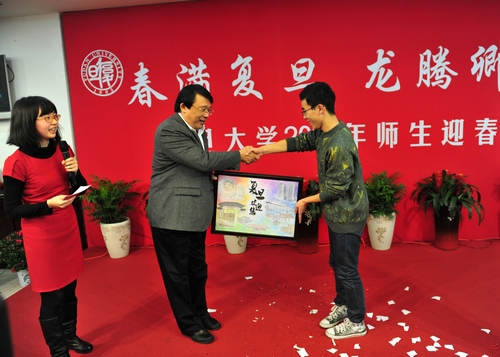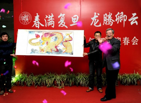 随着校长杨玉良老师抽出了迎春会唯一的特等奖,迎春晚会也渐至高潮。一幅长1.2米、由学生制作完成的“龙腾卿云”图展现在了师生面前,杨玉良校长亲自为这幅尚未完成的绘画作品“点睛”,寓意复旦在新的一年中龙腾虎跃、更进一步。他还向大家透露了一个小秘密,原来今年也是杨校长的本命年。他表示要在自己的本命年中,带领复旦大学向更高的发展方向阔步前进;一幅“春雨无声润桃李,甘之若饴,文德播四海;新苗有志为栋梁,玉汝于成,良才遍九州”的对联从舞台两侧的“上空”缓缓飞下,在悠扬的音乐声中,杨校长为在座的师生们读出了此幅对联的横批“欣欣向荣”。