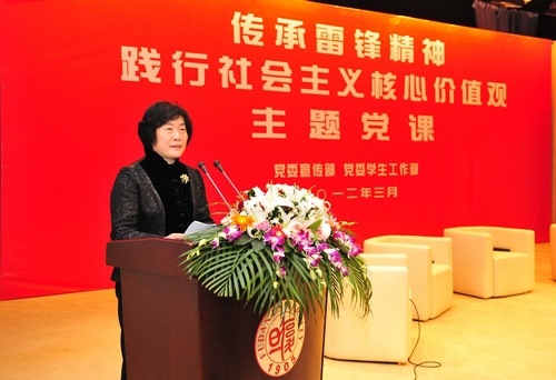 校党委副书记刘建中出席了当天的主题党课并致辞。她要求,全体学生党员不仅要在课堂里学,更要走出课堂,走向社会,用行动学。刘建中强调,学生党员应自觉传承与弘扬雷锋精神,提高思想道德水平,积极参与各项“学雷锋”活动和公益志愿服务,努力成为中华民族传统美德的传承者、良好社会新风尚的创造者和社会主义核心价值观的模范实践者。
