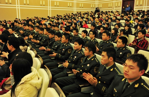 武警上海市总队一支队十中队副指导员蒋可鹏,向大家详细报告了30年来一支队十中队官兵在南京路沿线继承好八连传统、模范践行雷锋精神、忠于职守、服务人民、无私奉献的先进事迹。当蒋可鹏说起,自己因为部队执勤、世博安保、世游赛安保等任务三次推迟婚期,引发了恋人的不满与动摇,最终恋人来到部队看到了他的辛苦与奉献,义无反顾与他完婚的故事时,同学们爆发出了热烈的掌声。一个个真实而鲜活的故事,打动和感染了在场的所有听众,也让同学们感受到了雷锋精神中所包含的大爱和真情。