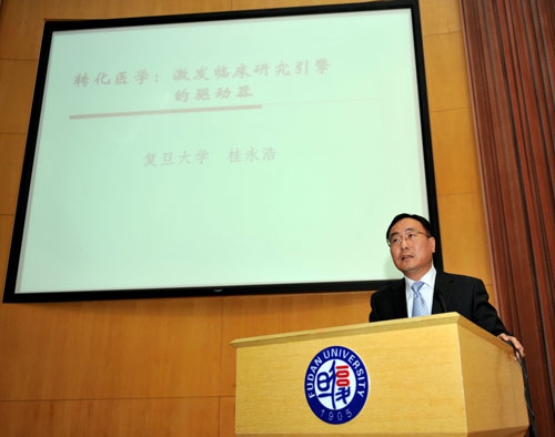 复旦大学副校长、上海医学院院长桂永浩致开幕辞,并以“转化医学:激发临床研究引擎的驱动器”为题作报告。他围绕21世纪医学研究的新动力、转化医学的发展、内容、研发过程等深层次问题阐明了自己的观点,并向与会者介绍了如何进行高校科研体制改革的想法与构思,受到与会者欢迎。他说,转化医学是近年来国际医学科学领域出现的崭新概念,转化医学致力于弥补基础实验研发与临床应用之间的鸿沟,为开发新药品、研究新的治疗方法开辟新途径。21世纪临床医学面临新的挑战,人类疾病谱发生了巨大变化,以肿瘤、心血管疾病、遗传性疾病为代表的多因素致病危险性急剧增加,用对单因素致病的传统研究方法已经无法解决疾病的诊断、治疗、预后判断、危险因素评估和预防措施的需要。如何寻找在取得同等临床疗效的前提下的最经济的诊断和治疗手段,是我们医学界面临的重大考验。人的生命现象和生命过程不可能在实验室被设计出来或重复出来,如果没有临床科学家的努力,没有临床医学的突破,任何重大疾病研究都不可能取得真正突破。目前,基础研究与临床问题解决之间存在脱节,疾病谱的转变使医疗成本大大增加,医学界面临着基础科学研究积累大量数据的意义需要解析,基础研究和药物开发及医学实践三者需要整合,这就更需要未来的医学科学研究中的自主创新主要方向应转向临床与实验室的密切结合,只有这样才能解决当今医学发展中遇到的问题。如今,临床的问题解谜最终已经不能有单一专业的科学家来完成,科学需要不同技能和学科背景的专业人员紧密合作,只有多学科交叉的团队,如生物学家、工程学家、计算机专家、临床专家等密切合作,才有可能彻底揭示环境、生活方式、遗传因素、分子机制对疾病发生的相互作用。