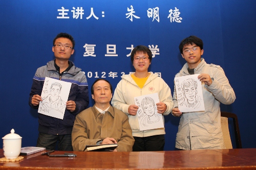 讲座结束时,朱教授以“祖国人才济济时,必是中华崛起日”寄语复旦学生,鼓励大家无论是在学习上还是在今后的工作中,遇到困难时要坚韧不拔,顺境时也要戒骄戒躁,学会保持身心健康,平衡好忍耐与实现之间的关系。讲座结束后,朱教授还为一些积极参与互动的同学现场创作了肖像画并合影留念。