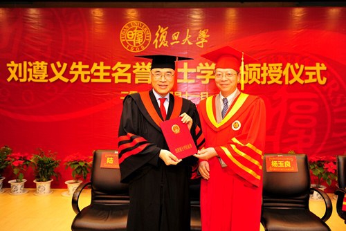 新闻中心讯 2012年4月11日,复旦大学正式授予中投国际(香港)有限公司董事长、原香港中文大学校长、知名经济学家刘遵义经济学名誉博士学位。学位颁授仪式当天在复旦大学光华楼隆重举行。复旦大学校长、校学位评定委员会主席杨玉良在仪式上宣读了国务院学位委员会的决定并向刘遵义先生授予复旦大学名誉博士学位证书。副校长冯晓源在仪式上介绍了刘遵义先生的情况及其所取得的成就。副校长、校研究生院院长陆昉主持了当天的授证仪式。