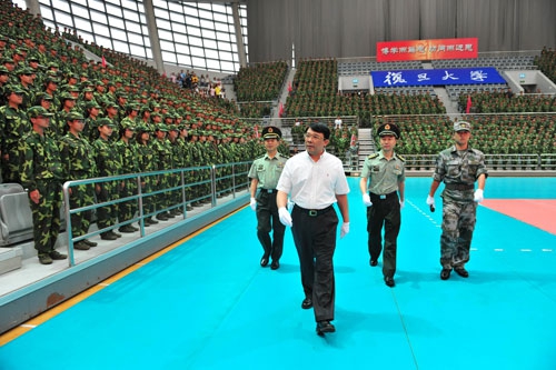 在庄严的升国旗仪式后,朱之文书记与叶志胜少将、封晓冰大校一同检阅军训部队。同学们斗志昂扬,英姿勃发,用洪亮的声音向首长问好,展现了复旦2011级军训学子良好的精神面貌。