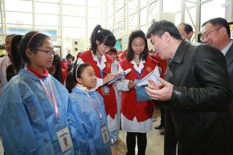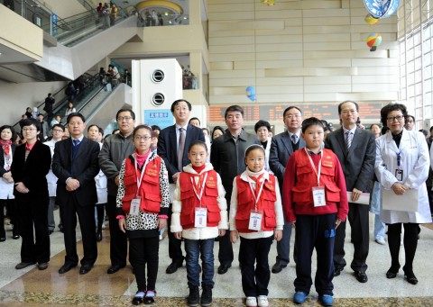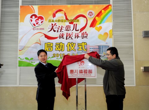 燕爽,桂永浩,邬惊雷,黄国英、徐虹与4名儿童观察团成员一起为“关注患儿就医体验”三年行动计划项目亮灯;萧思健、夏景林为“患儿体验部”揭牌;3月24日当天,复旦大学附属儿科医院首批4名上海少年日报社推荐产生的儿童观察员穿上了医院特制的蓝色隔离服走进门诊部,体验医护人员工作,医护人员也主动要求他们以孩子独特的“视角”对医院各项工作和环境“吹毛求疵”。4名观察员毫不吝啬自己的眼光,对医院的各个角落进行“评头论足,说三道四”,其中有一位对在现场的医务人员说,我每次来这里看病,你们门诊大厅的宣传视频的内容都是一样的,可以换换吗?医院正是希望通过“倾听”,了解孩子的感受、建议甚至督促,主动转变、完善,提高服务质量,促进医患和谐。