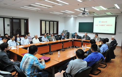 新闻中心讯 5月15日,在谷超豪教授诞辰87周年之日,复旦大学首届“谷超豪奖”颁奖仪式在数学科学学院举行。校长杨玉良、副校长金力,中科院院士、南京大学孙义燧教授及夫人张天岭女士,台湾中央研究院院士、哥伦比亚大学周元燊教授,中科院院士洪家兴教授,上海师范大学郭本瑜教授,华东师范大学沈纯理教授出席颁奖仪式。参加颁奖仪式的还有数学科学学院的教师和学生代表,以及上海复旦大学校友会的代表。仪式由科技处处长殷南根主持。