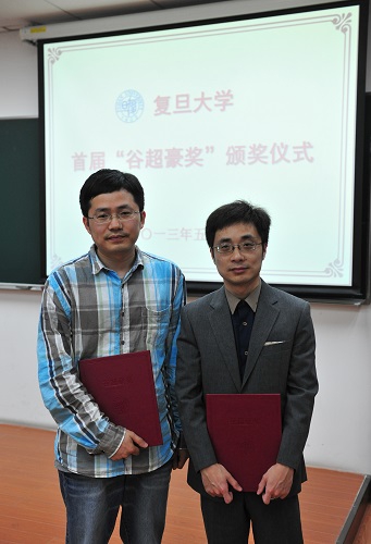 嵇庆春教授,今年37岁,先后在MSRI、Harvard大学数学系学习和访问。近年来,稽庆春教授科研活跃,成绩显著。在用L2方法研究微分几何和多元复分析中的若干基本问题方面做出了贡献。谢纳庆副教授,今年33岁,2011年入选复旦大学首批“卓学”人才计划。 近年来,谢纳庆博士科研活跃,成绩显著,在数学广义相对论中与正质量定理相关的几何分析方面做出了贡献。两位获奖者对谷超豪先生表达了感激之情,对于学校和学院创造的工作环境表示感谢,认为做好科研是对谷超豪先生的最好纪念。