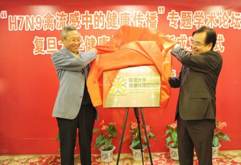 胡锦华、毛群安为复旦大学健康传播研究所成立揭牌。