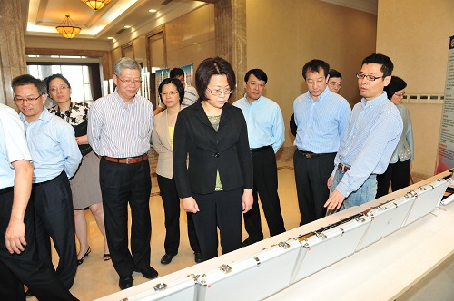翁铁慧一行首先参观了位于微电子楼的微电子学院净化实验室,在实验室工作人员的帮助下,大家穿上特制的防尘服进入实验室参观。微电子学院院长严晓浪,副院长张卫、闵昊,复旦微电子公司俞军等人陪同参观并介绍了实验室情况。随后,翁铁慧一行来到光华楼西主楼30楼观看了成果展示,听取我校专家汇报并交流座谈。