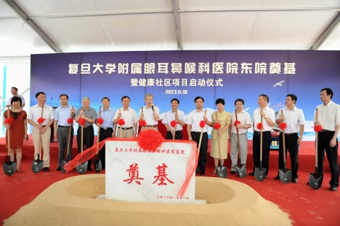 复旦大学校长杨玉良,上海市卫生计生委副主任瞿介明,复旦大学副校长、上海医学院院长桂永浩,闵行区副区长杨德妹,上海市医改办副主任、市卫生计生委副巡视员许速,上海申康医院发展中心副主任陈方和闵行区政协副主席、浦江镇党委书记潘金平,眼耳鼻喉科医院院长孙兴怀、党委书记李华,承建单位上海建工一建集团总裁徐飚等出席奠基仪式,并共同为东院建设项目培土奠基。