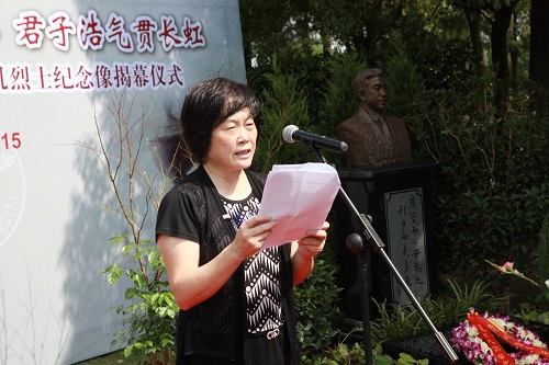 苍松翠柏之间,参加揭幕仪式的全体代表肃立在费巩烈士像前,深切缅怀他学植深厚、桃李天下的师者风范和反对专制、追求民主的浩然正气。复旦大学党委副书记刘建中在致辞中表示,费巩不仅是复旦的同龄人,更是复旦校友的杰出代表,在他的身上集中体现了“团结、服务、牺牲”的复旦精神品质和“学术独立、思想自由”的学术理念,复旦为拥有费巩这样的校友感到无比的自豪和光荣。各位代表也纷纷表达了继承和发扬先贤精神,用实际行动为实现伟大的中国梦而努力奋斗的决心,并献上花环和鲜花寄托对烈士的缅怀与追思。