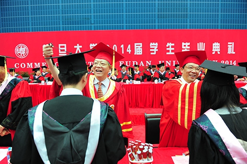 当天,按照复旦的传统,在主席台第一排就坐的依然是部分来自文、理、医各个学科的知名学者、院士、教学名师代表。主席台两侧,高悬着这样一幅对联:“绚丽青春,博学笃志践真理,常系国家;闪亮人生,切问近思求真善,惟将努力”。毕业典礼由常务副校长陈晓漫主持。