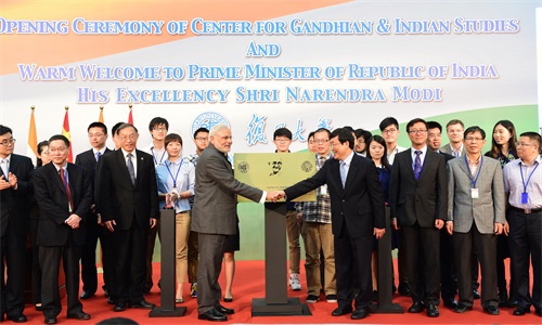 新闻中心讯 5月16日下午,印度总理纳伦德拉·莫迪(Narendra Modi)到访我校,出席甘地和印度研究中心揭牌仪式。中国人力资源和社会保障部部长尹蔚民、中国驻印度大使乐玉成、印度驻华大使康特陪同访问。上海市市长杨雄、复旦大学党委书记朱之文、校长许宁生在光华楼金厅会见了莫迪一行。会晤结束后,莫迪总理一行来到光华楼志和堂,和许宁生校长一道为甘地和印度研究中心揭牌。随后莫迪总理发表了演讲。