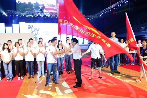最后走上红毯的是2015年西部计划志愿者和第17批研究生支教团的成员,他们即将启程前往宁夏、新疆、贵州、西藏等地开展为期一年的志愿服务和支教工作。他们在毕业的红毯上接受了全场观众的致敬欢呼,从许宁生校长的手中接过了出征的队旗。随后,许宁生校长在汇集了手印的复旦墙上印染下“复旦大学校歌”几个字。此时,复旦墙上出现了发光的五线谱,手印在五线谱上逐个闪亮起来,连缀成跳动着的音符,奏出了校歌熟悉的旋律。这象征着每一位复旦人,都是复旦这所学校不可分割的一部分,所有人携手并肩站立,就能谱出最为华美的乐章。