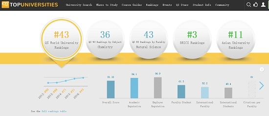 近年来,我校在该榜连年跃升,从2014年位列71名到2015年第51名,再于今年一跃至43名,使得中国高校在前50强学校中占据三席,仅次于美国和英国。在欧美领衔的这一榜单中,成为中国高校跃升速度的重要代表,QS对此评价道:“全球快速发展的新兴经济体也在高等教育上形成了领先集团。”