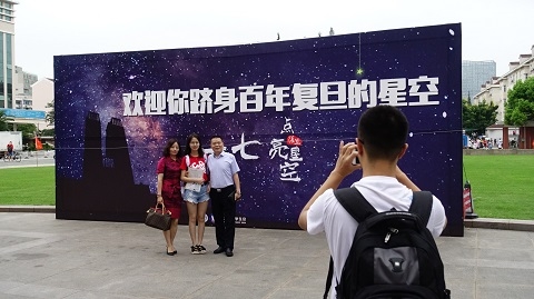 复旦五位老校长卡通形象的创意合影区成为迎新日的一处景观。