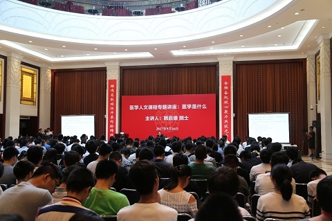 在讲座最后韩院士讲到,人们对现代医学的不满,不是因为她的衰落,而是因为她的昌盛;不是因为她没有作为,而是因为她不知何时为止。人们因为成就生出了傲慢和偏见,因无知而变得无畏,因恐惧而变得贪婪。常常忘记医学从哪里来,是如何走到今天的,缺乏对医学的目的和要到哪里去的思考。医学是什么,这看似触发永恒的哲学追问,其实就是“医学人文”需要解释的问题。韩院士勉励在座各位医学生不忘医学的初心,不管医学技术如何变革,相信医学始终是人类情感和人性的表达。