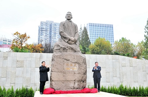 桂永浩、上医创始人颜福庆先生之孙颜志渊一起为颜福庆像揭幕。学生代表向颜福庆像献上花篮。