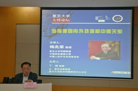 4月11日,复旦大学2018年“大使论坛”举行,邀请我校特聘教授、中国前驻德大使、中国人民外交学会前会长梅兆荣大使就当前德国内外处境和中德关系作精演讲,吸引了来自复旦大学和沪上其他高校及研究机构的师生三十余人。论坛由复旦大学欧洲问题研究中心(欧盟优秀让·莫内欧洲研究中心项目,NO.2015-2629支持)主办、中国欧洲联盟研究会协办,复旦大学欧洲问题研究中心主任丁纯教授主持。