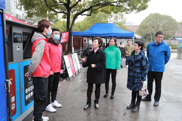 在北区生活垃圾集中投放点,由学生党员志愿者担任的垃圾分类督导员们耐心细致地指导同学进行垃圾分类。焦扬一行上前详细询问了园区垃圾分类的具体开展情况,并和前来扔垃圾的同学交流实行垃圾分类给校园生活带来的新变化、新体验。