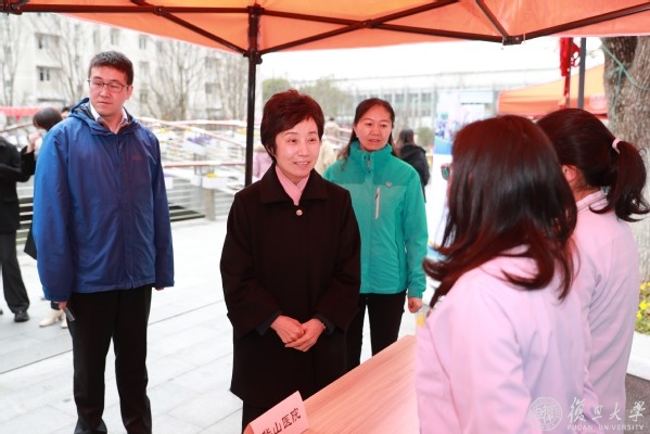 焦扬一行来到华山医院与五官科医院的摊位前,一位刚结束问诊的学生告诉说,“前两天看电脑眼睛酸涩,今天刚好吃完饭就来问诊,医生也给了我日常眼部保健的小方法。”看到特地从医院赶来参加志愿服务的医生们在风中手都冰凉了,焦扬在询问了解附属医院开展志愿服务的情况同时,关心说:“我们医院的医生们很不容易,通常都要上午看门诊,中午还要赶过来参加义诊,把吃饭和休息的时间挤出来做志愿服务,感谢你们!”