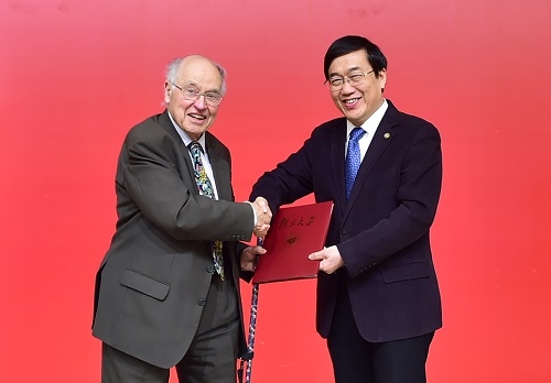 报告会前,中国科学院院士、复旦大学校长许宁生为迈克尔·阿蒂亚和阿兰·孔耐颁发复旦大学荣誉教授聘书。受聘仪式由中国科学院院士、复旦大学常务副校长包信和主持,公众报告由上海市数学会理事长陈晓漫教授主持。