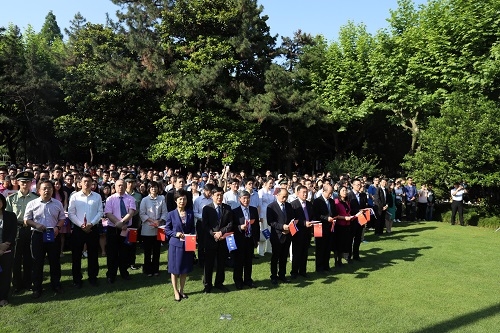 老师们、同学们、校友们,历经112年的卓绝奋斗,复旦大学已经站在了新的历史起点。历史的接力棒已经传递到了我们手中。前辈先贤们为之奋斗一生的事业,为之弘扬一生的精神,将由我们去继承、去发扬。我们要更加自信,更加担当,更加坚定地向着梦想前行,更加执着地为了梦想奋斗,加快推进“双一流”建设,以优异成绩迎接党的十九大胜利召开!