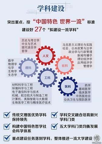 学校将以“一流育人质量、一流学术成果和一流社会贡献”为核心目标,重点建设27个一流学科,带动一级学科重点发展、融合发展和特色发展;注重学科融合创新和前沿发展,不断优化布局,形成五大学科门类整体发展新格局;以学科建设为龙头,带动一流大学建设。学校通过设置重点建设项目,从学校层面及各学科进行内涵建设,以质量和效益为标杆,发挥校院两级和师生积极性,确保一流大学和一流学科建设落到实处。