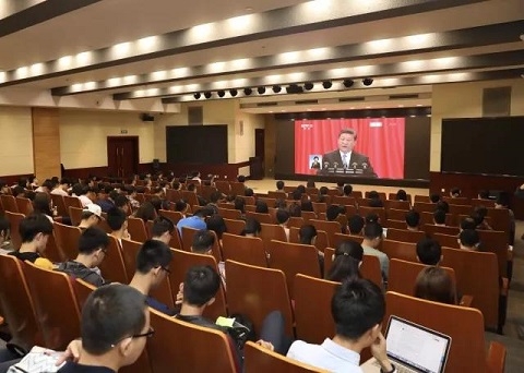 今日上午10时整,复旦大学师生在光华楼集中收看此次大会,并认真聆听习近平总书记在纪念大会上的重要讲话。复旦大学党委书记焦扬,党委副书记许征、刘承功,校内部分专家学者,马克思主义学院教师和研究生代表,校部机关党员代表和复旦大学习近平新时代中国特色社会主义思想研究会会员等200余名师生一同收看了直播。