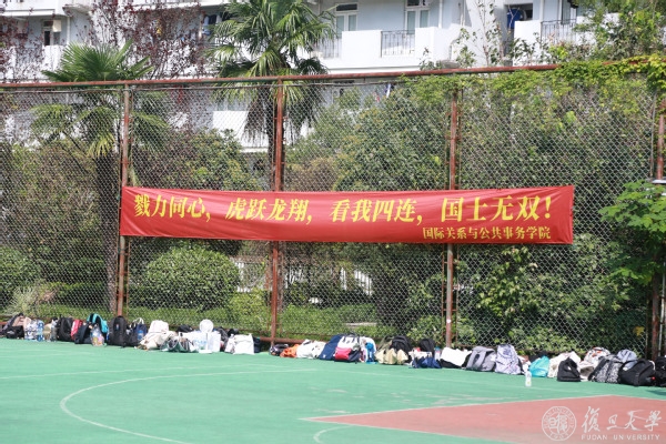军训4连国际关系与公共事务学院的口号条幅