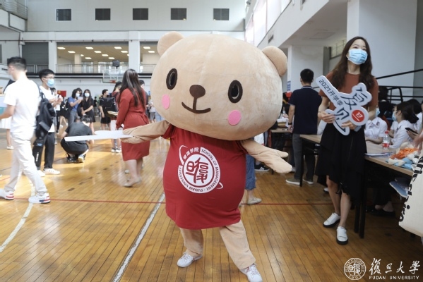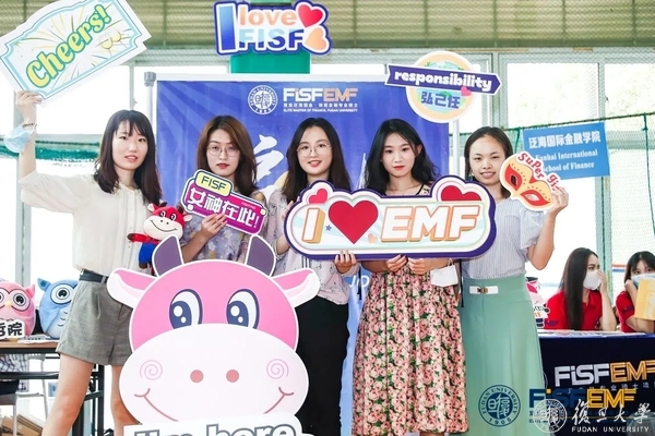 泛海国际金融学院今年精心准备了新生入学照拍照处。在标志着“启航”的蓝色背景板前,金融专硕项目的同学们纷纷拿着项目吉祥物小牛与“我爱复旦”等举手牌打卡,留下了作为研究生新生的第一张照片。