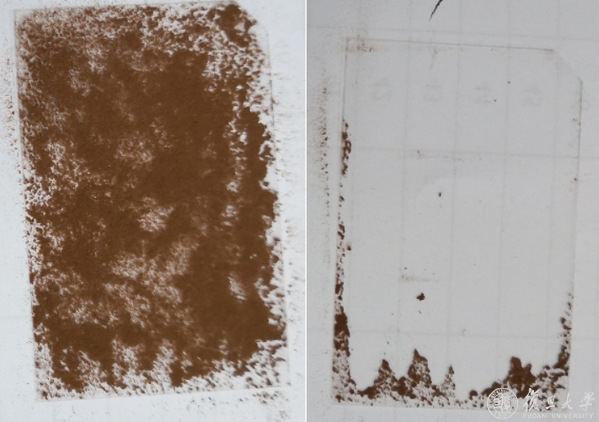 实验室中涂覆除尘涂层的玻璃盖片的重力除尘效果(左图-除尘前,右图-除尘后)